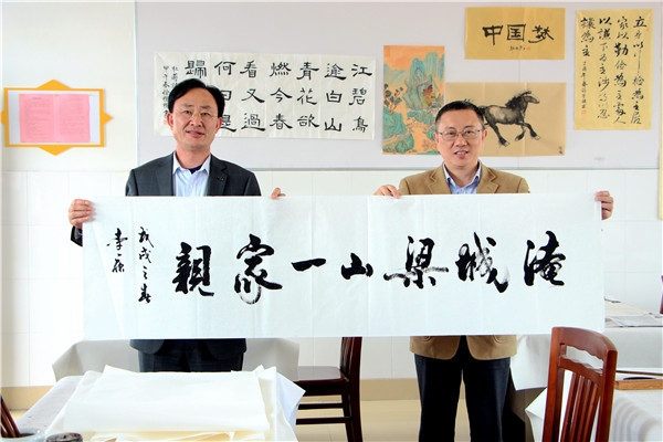 美好的时光总是短暂,校长代表团在短短三天的交流中与学校结下了深厚的友谊,梁山县韩垓镇中学校长李康挥毫泼墨,写下“淹城梁山一家亲”赠予学校。