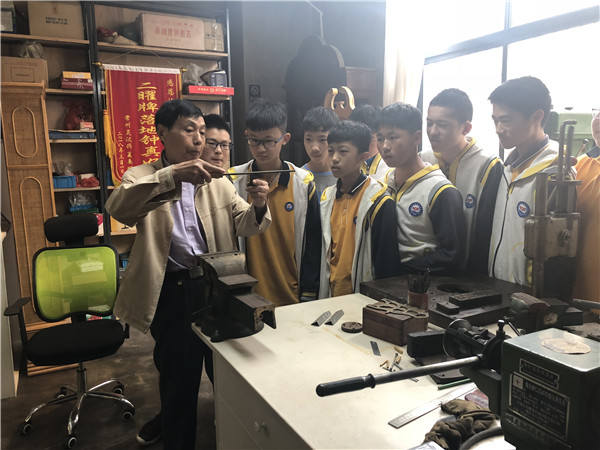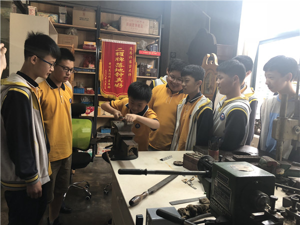 参观完毕,许老领孩子们来到钟表制作工作室,工作室面积不大,摆放着车床等几种简陋的工具,工作台上还有一些钟表零件半成品,许老亲自示范操作,手把手地教学生制作零件,边讲解要领,边鼓励孩子们大胆动手去做。同学们都跃跃欲试,但干了一会儿,手就有点酸麻,看看成果,只有几点痕迹,看到工作室陈列的各种各样、风格迥异的钟表,都是许老一点一滴手工制造出来的,都极为敬佩他的毅力和坚定的人生目标。77岁的许老,精神矍铄,慈祥可爱,就是这样一个人,一辈子只做一件事,他是真正的大国工匠。“中国人开创了钟表史,我辈岂能等闲视之。”许老是这么说的,也是这么做的!