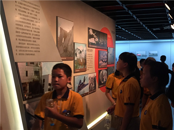 在人民防空和核生化展区,同学们领略了人类飞行和空袭发展史,从莱特兄弟发明飞机到1911年意土战争人类首次空袭,再到一战、二战及现代著名轰炸机,世界军事史上著名的战机模型呈现在眼前。通过展示德军轰炸伦敦,原子弹轰炸广岛、长崎,侵华日军轰炸重庆等重大空袭战例、并通过声、光、电多种手段使同学们亲身体验到空袭对城市所造成的巨大伤害和影响,真实的感受到了战争的残酷,感触到生活在和平年代的幸福。走出空袭隧道,同学们一起试听了防空警报声音,了解了防空警报对人们生活的警示作用。