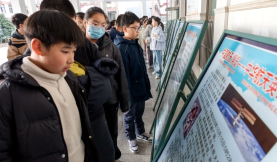 健身房门前的科普展板区人气高涨。一块块精心设计的展板以图文并茂的形式,系统呈现了重大科技成果及其在日常生活中的应用场景。从基础科学原理到前沿技术突破,从民生领域革新到生态保护实践,内容深入浅出、通俗易懂,有效拉近了尖端科技与青少年认知的距离,引导同学们发现“生活处处有科学”,学会用科学视角观察世界。